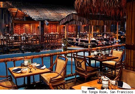 Designed by MGM set designer Mel Melvin in a South Pacific/nautical theme, the Tonga Room opened in 1945. The 1920's swimming pool became a water-filled lagoon with a small ship in the middle which doubled as a stage for band and every thirty minutes a thunderstorm erupts, and rain falls into the pool.
